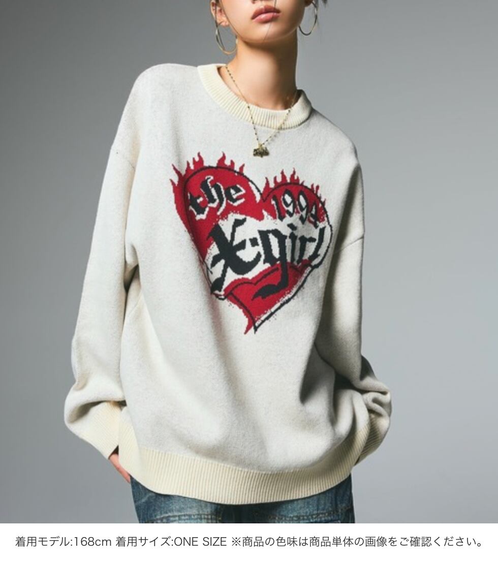 存在感たっぷりなハートモチーフのX-girlロゴが目を引くニットトップス。