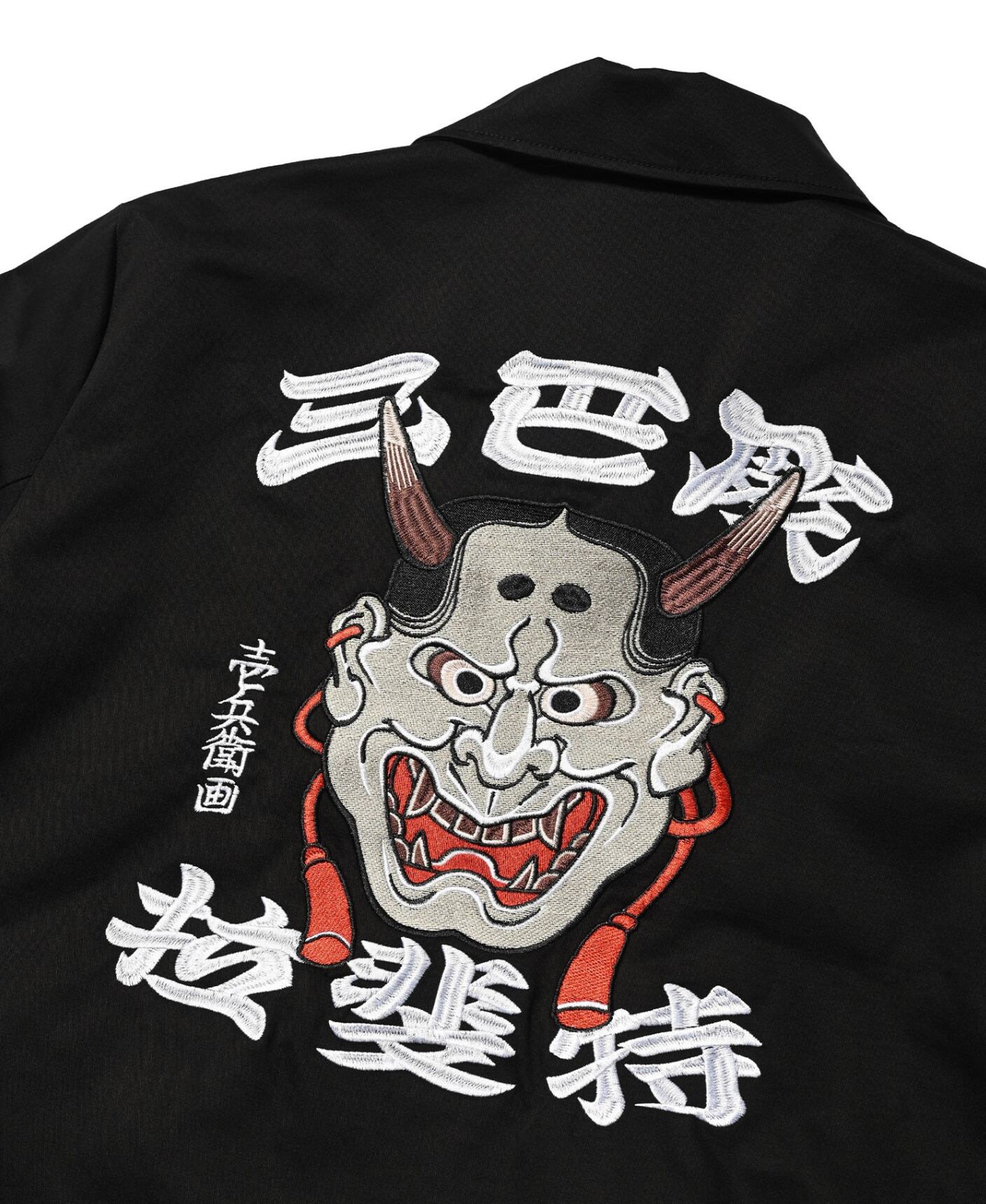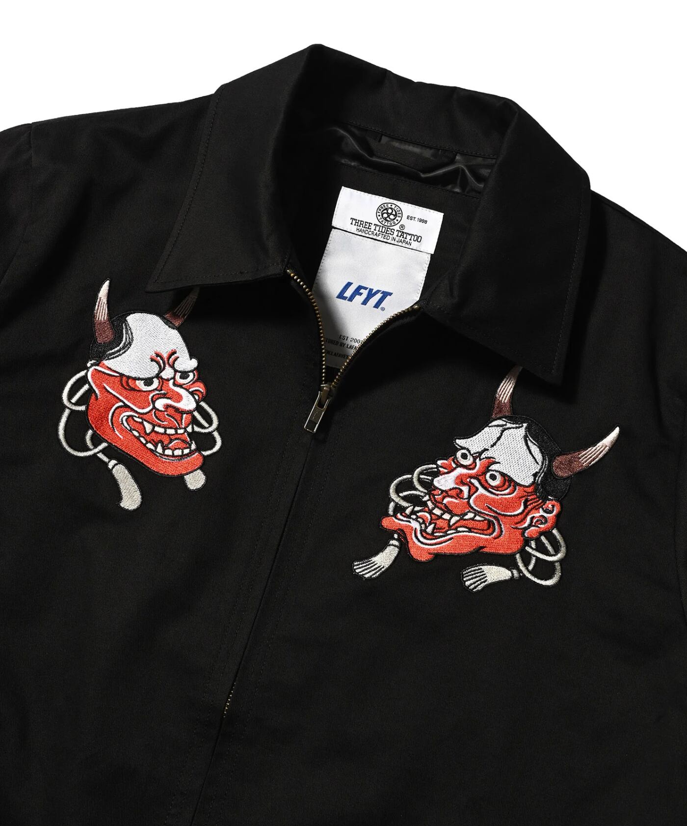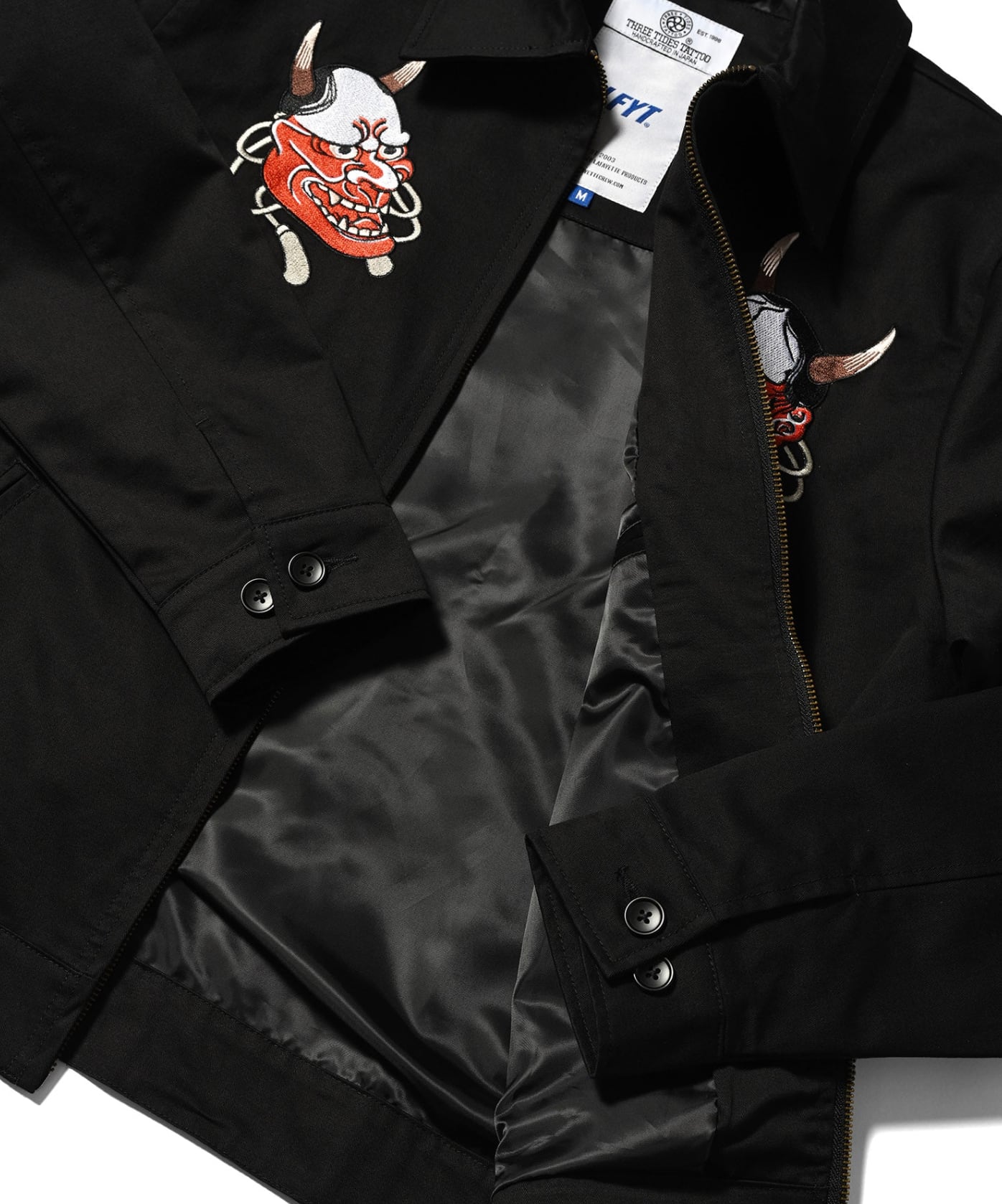 バックには、般若を中心に「三巴彫=THREE TIDES TATTOO」、「拉斐特=Lafayette」、「壱兵衛画=ICHIBAY」が刺繍。
