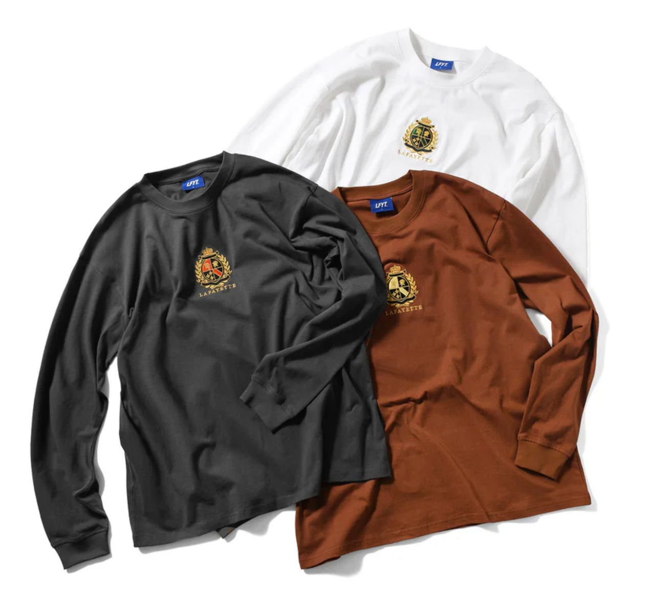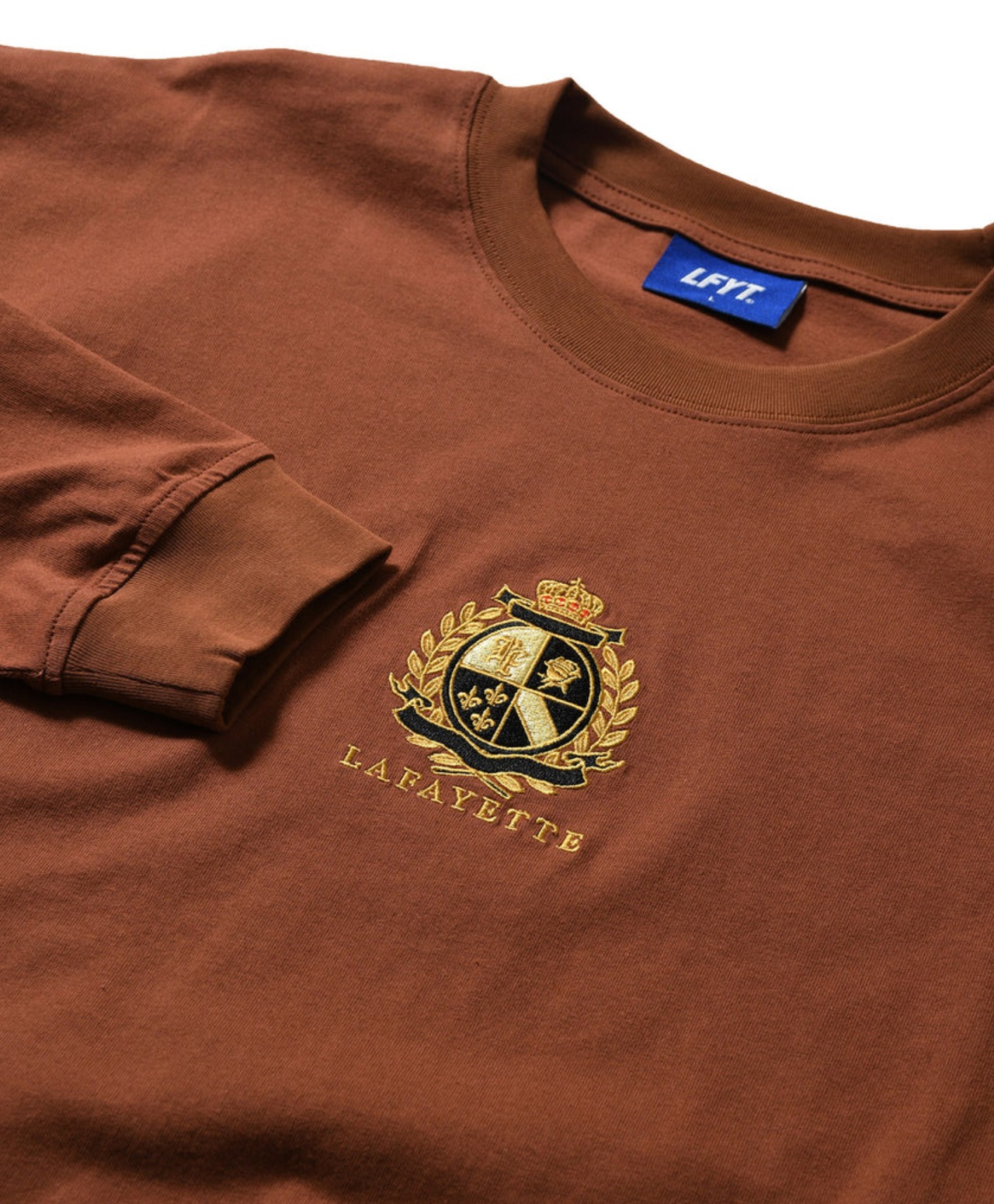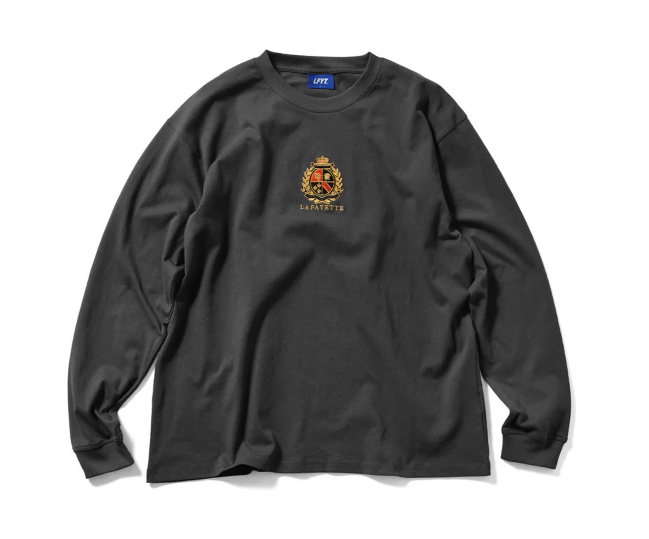エンブレム調デザインを刺繍で表現したL/S TEE。