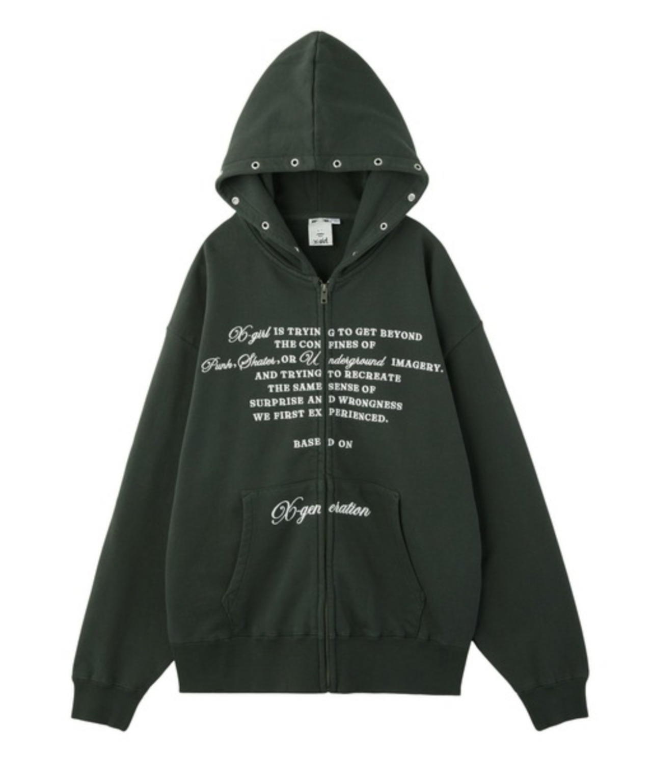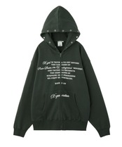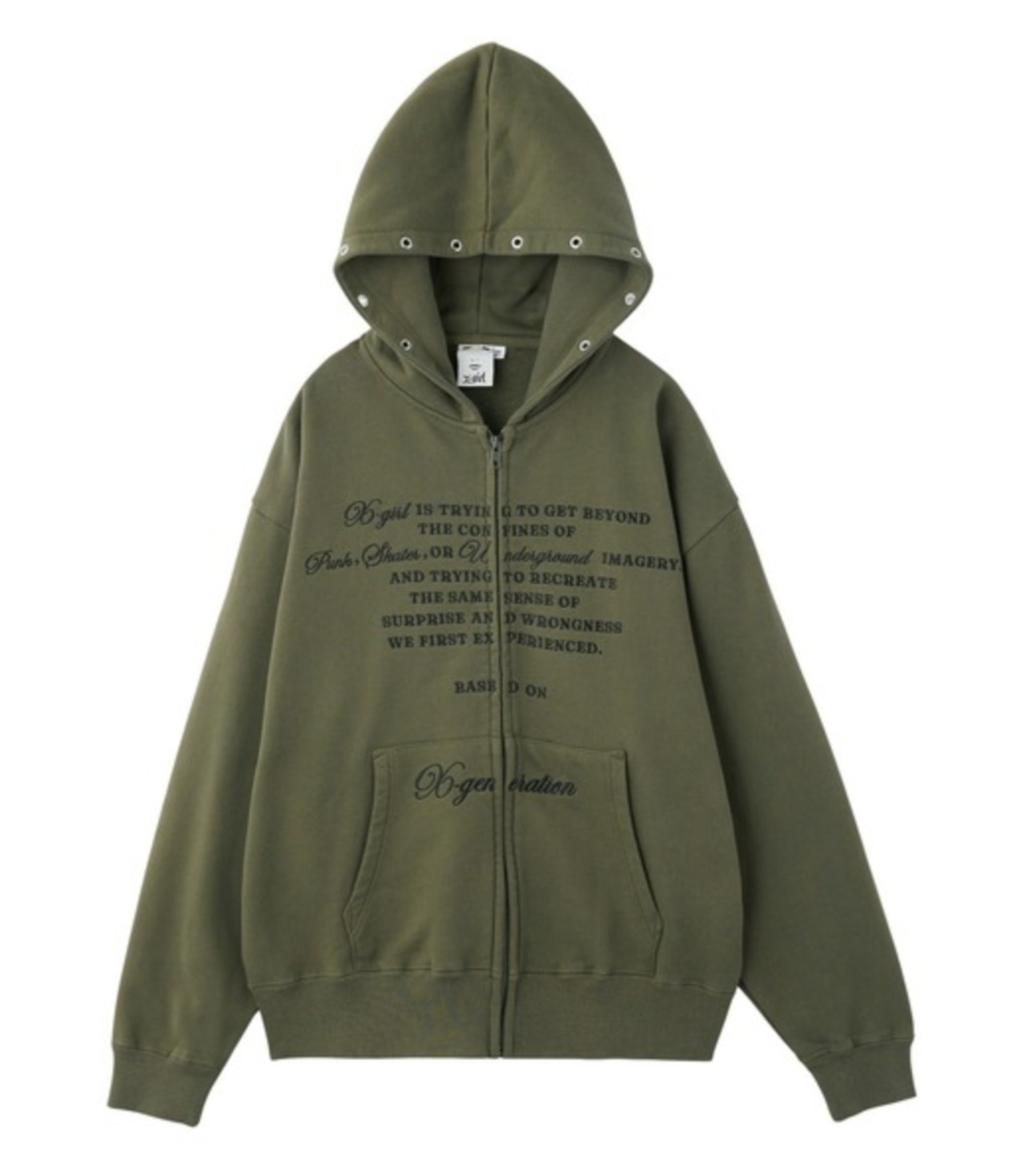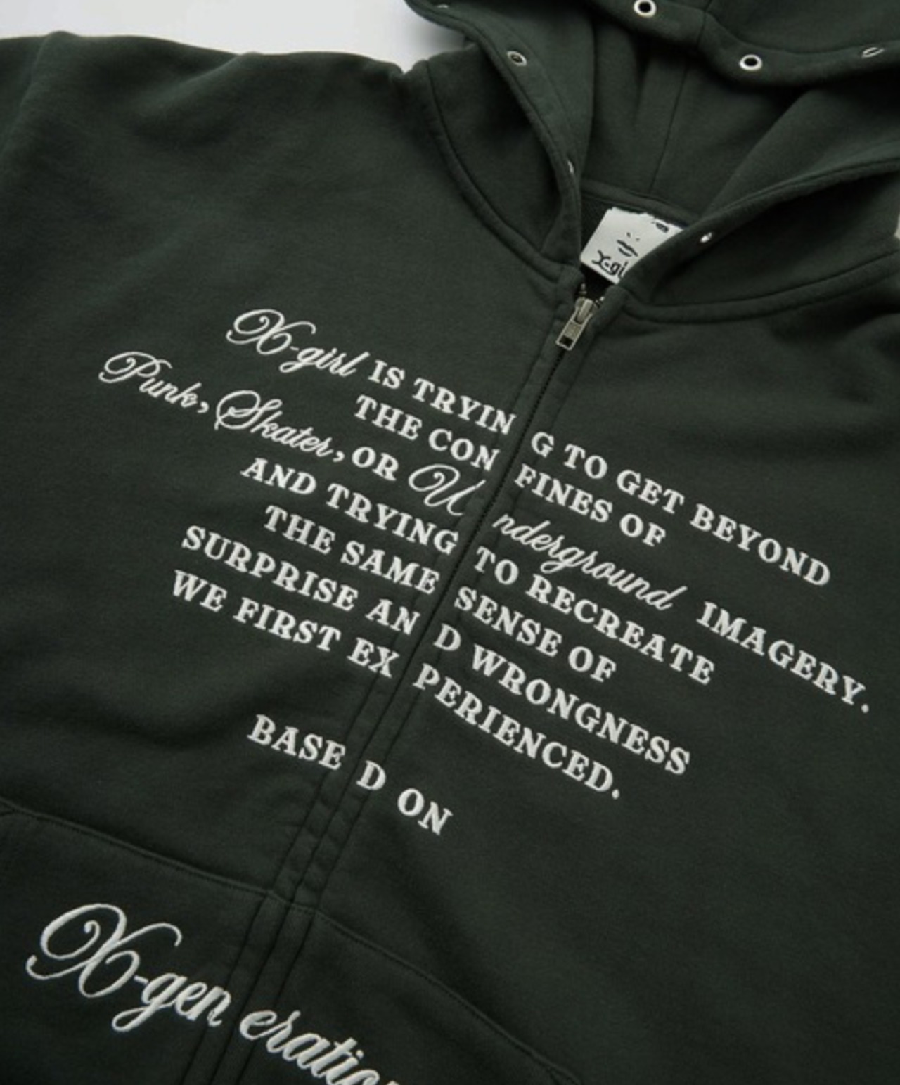 メッセージとロゴを、フロントのジップを跨ぎ刺繍で施したデザイン。