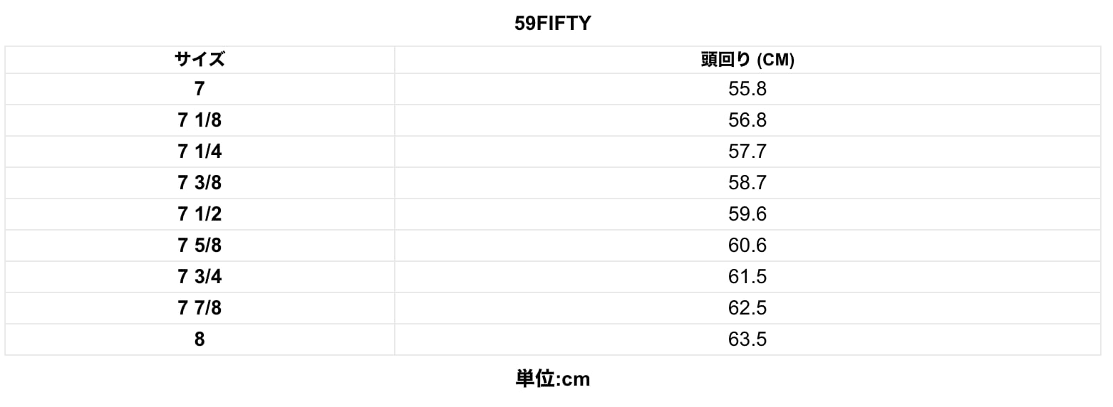 シルエットはニューエラを代表するスタイルの59FIFTY。フロントパネルの内側に独自の芯を作ることで型崩れしにくいクラシックなシルエット。サイズ調整のない仕様で、約1cm刻みのサイズ展開です。