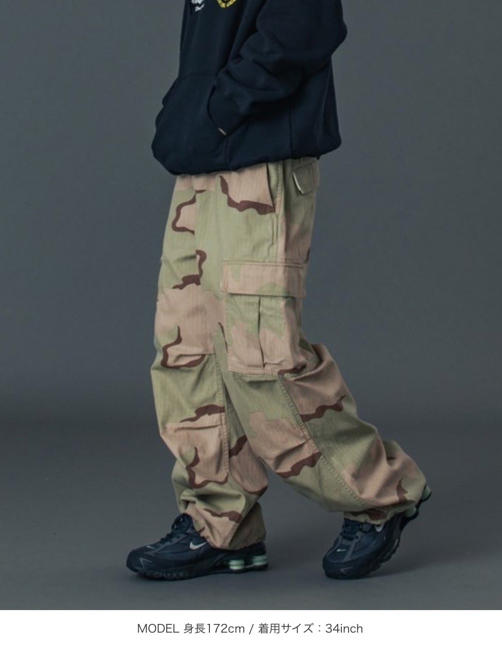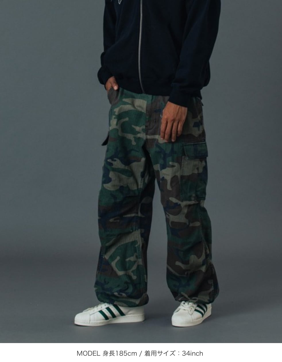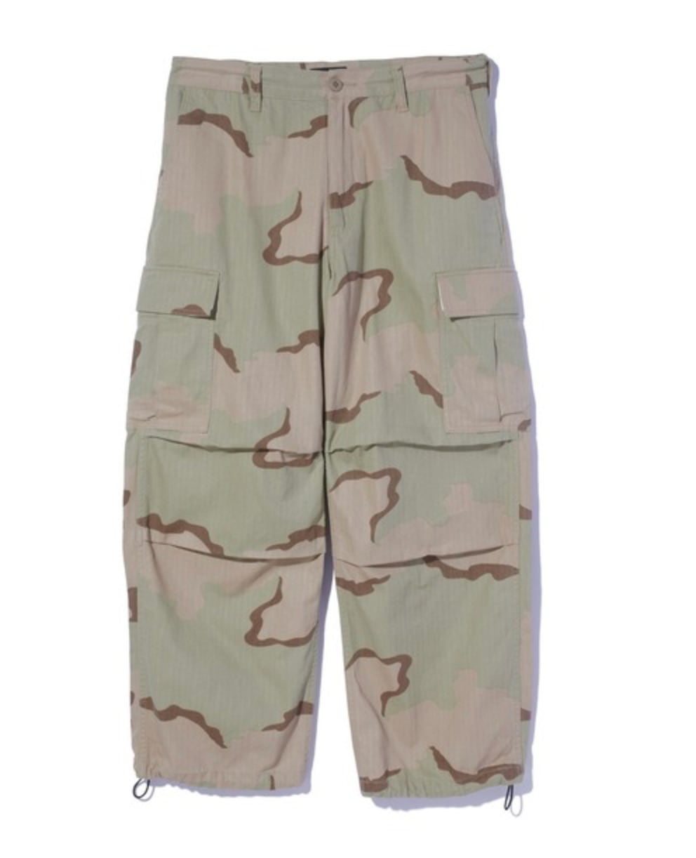 ・程よいウォッシュ加工を施したカモ柄のカーゴパンツ
