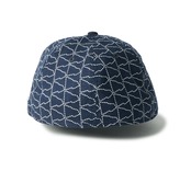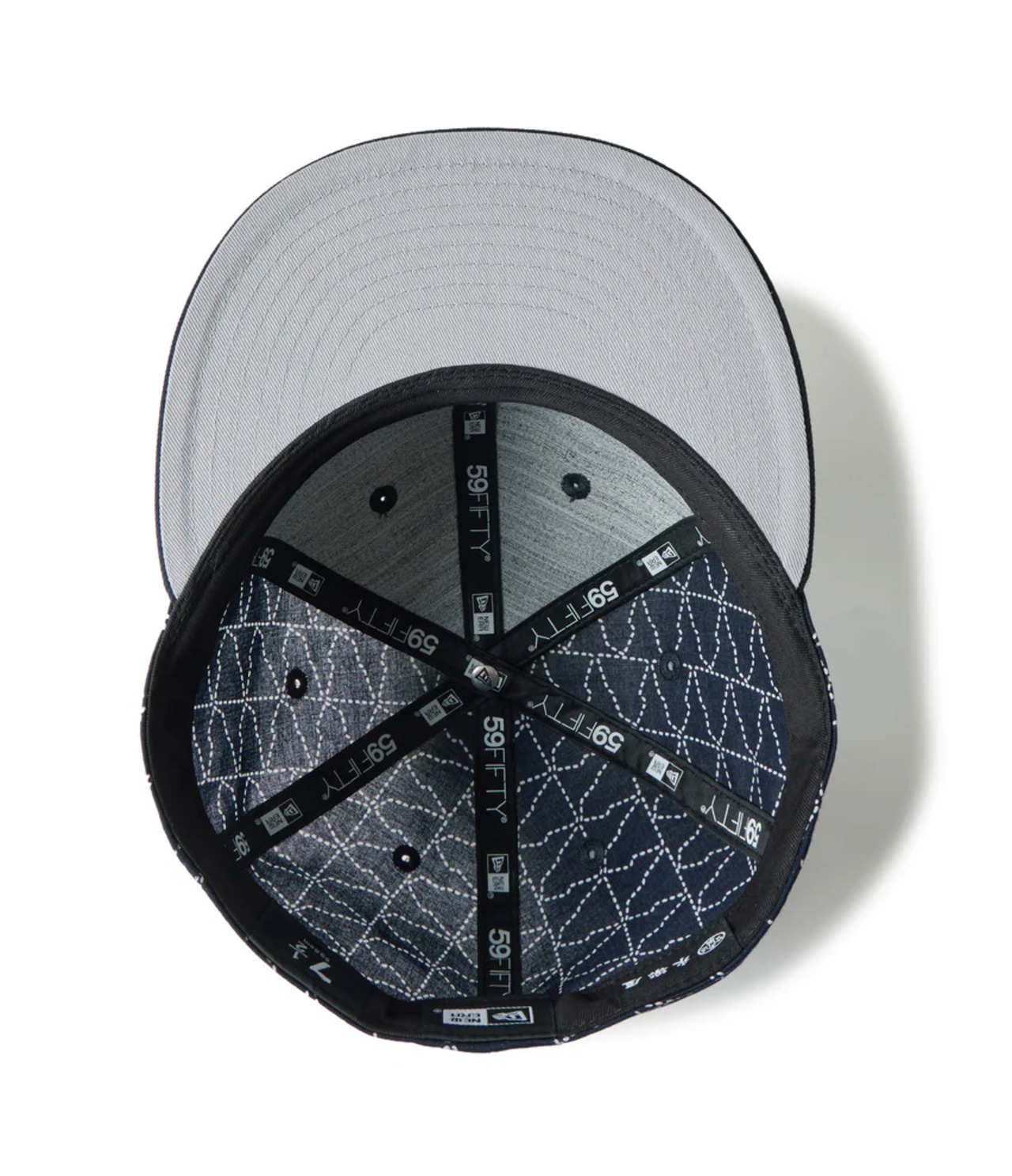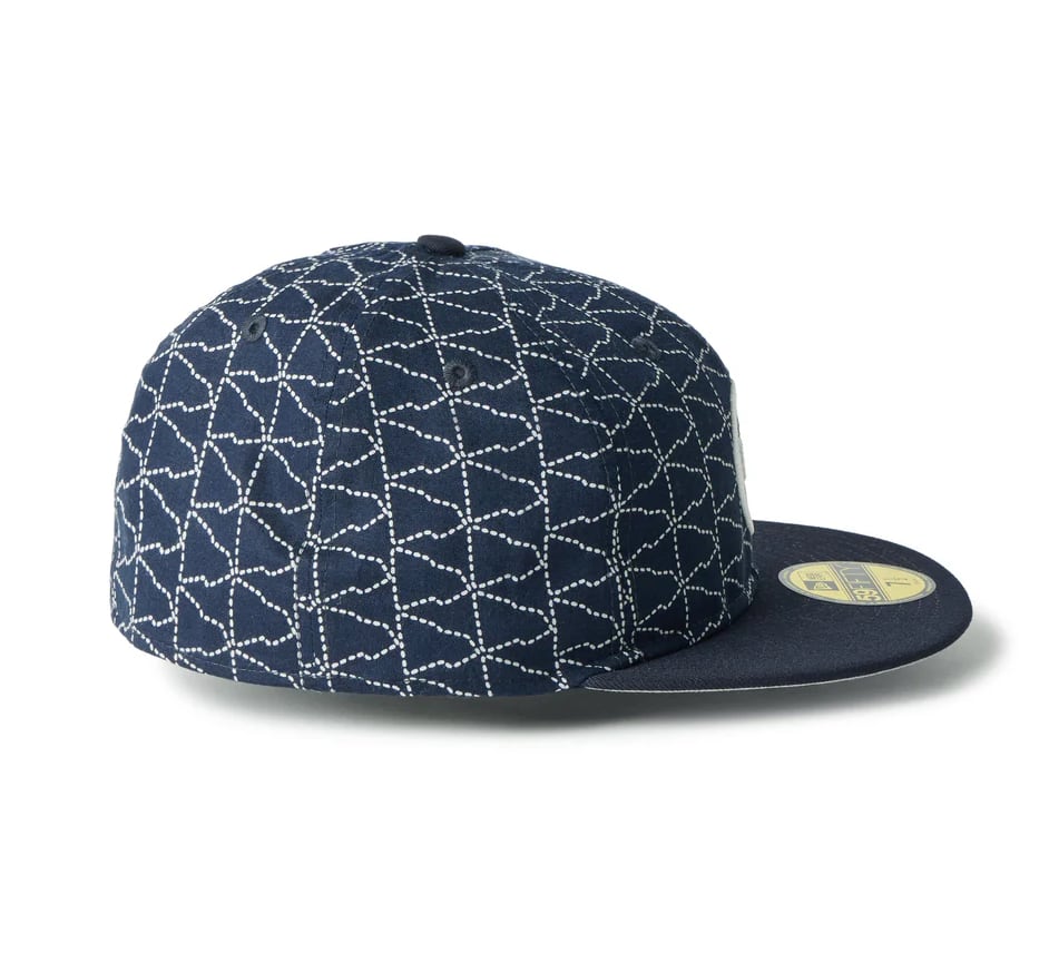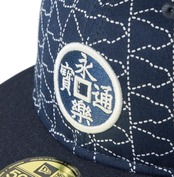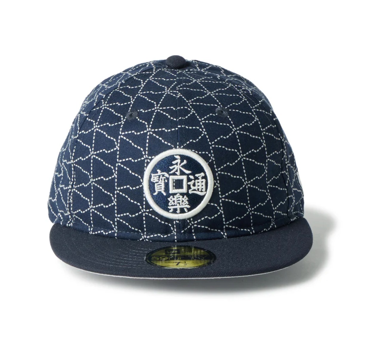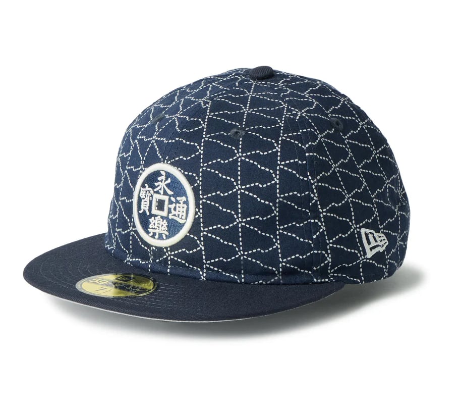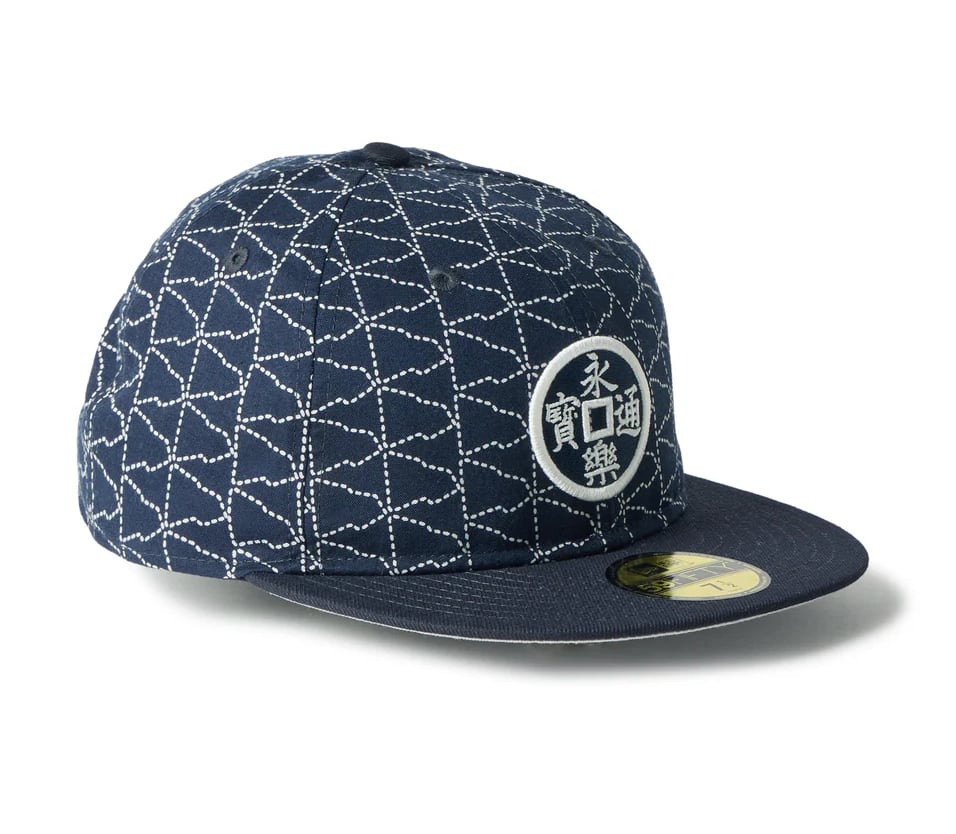 京都の老舗「永楽屋」とのコラボレーションによる、和の趣を感じさせる特別なコレクション。 江戸初期(1615年)創業の京都の老舗手ぬぐい専門店「永楽屋」に別注をかけた、オリジナル手ぬぐい生地を使用しています。フラッグロゴのアウトラインを刺子調にレイアウトした、唯一無二のオリジナルパターンです。[59FIFTY]モデルには、織田信長が好んで用いたとされる「永楽通宝」の意匠をフロントに刺繍で配置しています。